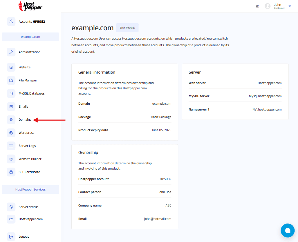 In the table, click on the domain you want to manage (e.g., example.com). This will open the domain-specific dashboard, displaying details such as general information, ownership, and server information.