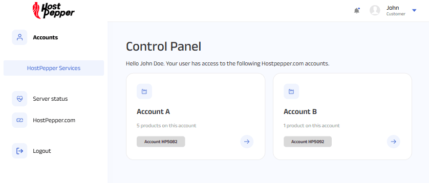 Click on the account for which you want to perform an action. You will be directed to the Products page, where you can view the associated domain and active packages.