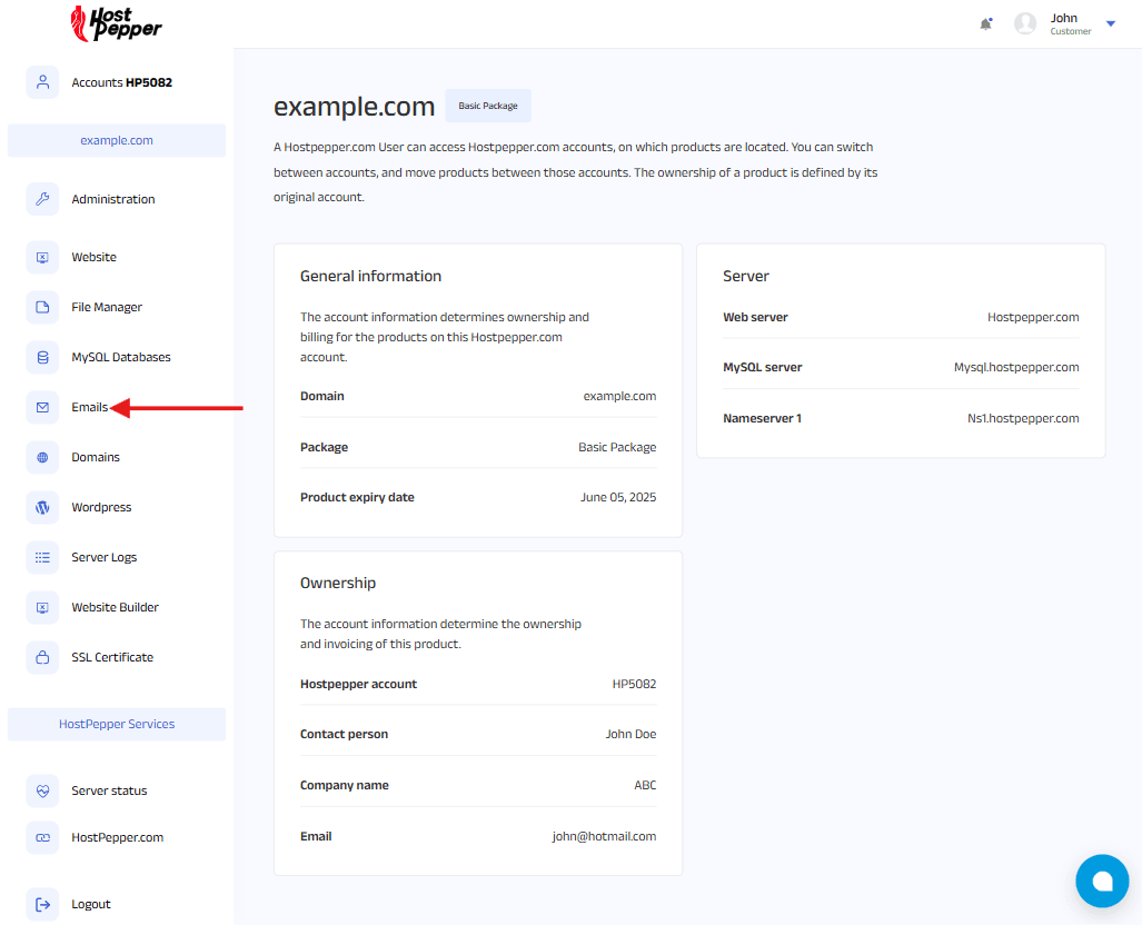 In the table, click on the domain you want to manage (e.g., example.com). This will open the domain-specific dashboard, displaying details such as general information, ownership, and server information.