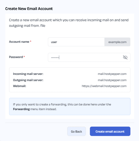 Enter the required information, then click the “Create Email Account” button in the bottom-right corner.