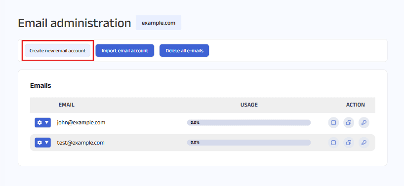 On the Email Administration page, click the “Create New Email Account” button in the top-left corner.
