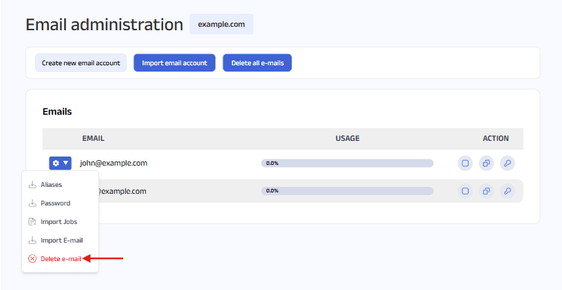 Select Delete e-mail from the menu. A pop-up will appear asking: Are you sure you want to delete youremail@example.com?