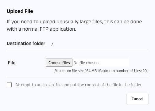 Note: If you need to upload unusually large files, please use the “Import From FTP” option. You can upload the files using any standard FTP client and then import them into the File Manager from this menu.