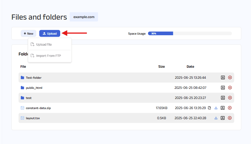Once you're on the File Manager page, click the “Upload” button next to the “New” button.