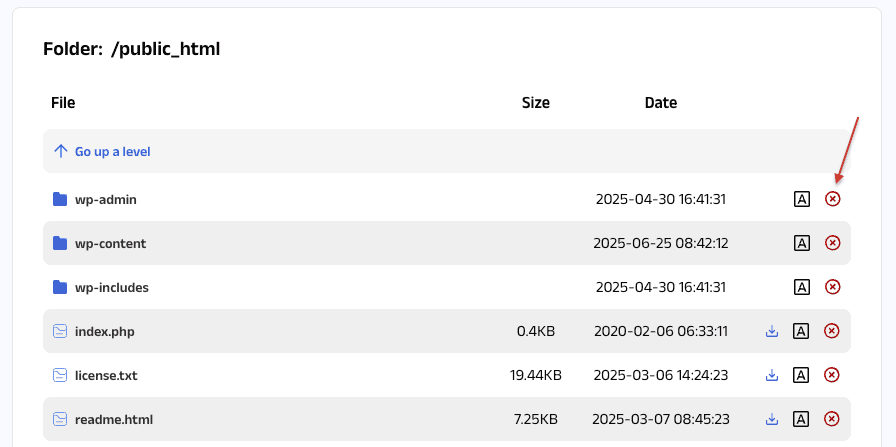 Once you're on the File Manager page, click the “X” icon next to the file or folder you want to delete.