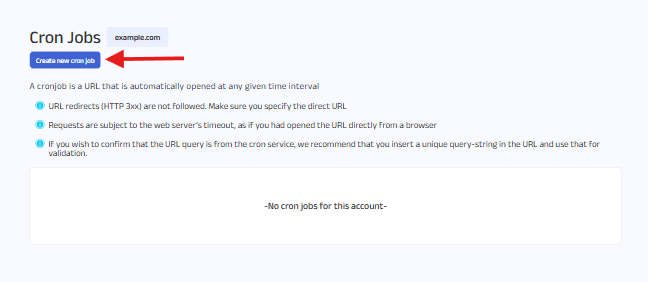 On the Website page, look for the “Cron Jobs” option and click it. Then, on the Cron Jobs page, click the “Create New Cron Job” button in the top-left corner.