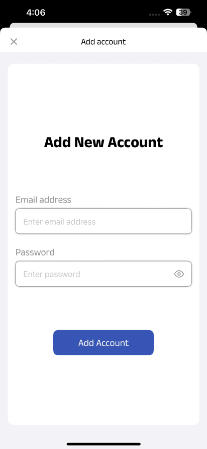 To add an account click on “Accounts” menu in your settings. Once opened, you can see this screen. Click on Add Account to add another account. Enter your email and password for the account you want to log into.