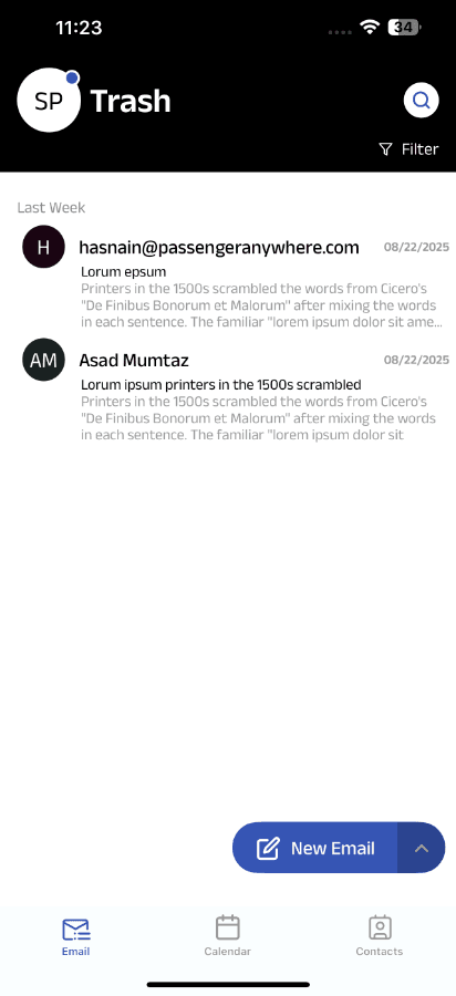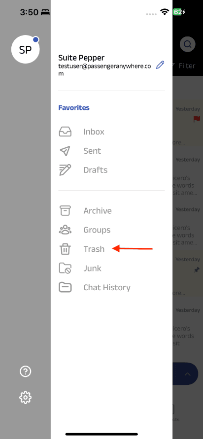 Emails that you have deleted will be available in the side menu. Swipe right to access the menu. Click on “Deleted” to access deleted emails.