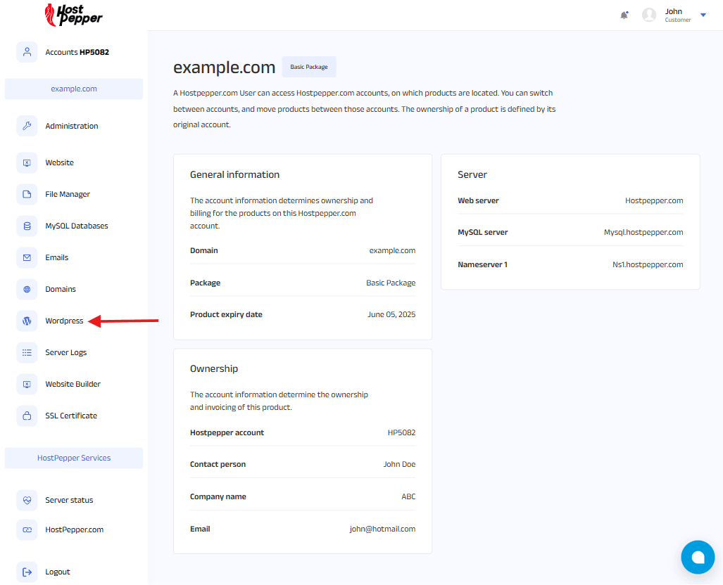 In the table, click on the domain you want to install WordPress on (e.g., example.com). This will open the domain-specific dashboard, showing details such as general information, ownership, and server information.