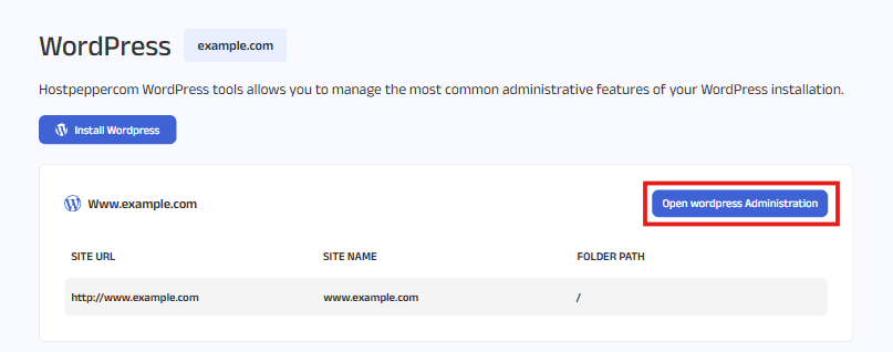 Click the “Open WordPress Administration” button located in the top right corner.
